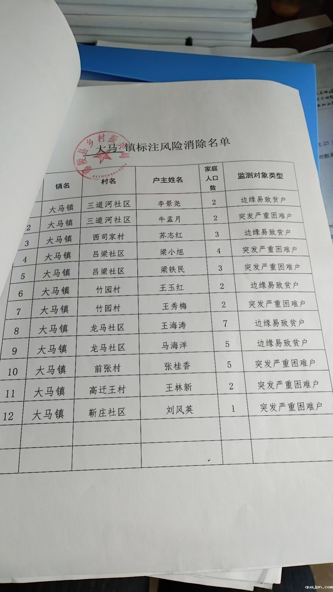 大马镇标注风险消除名单(12户)